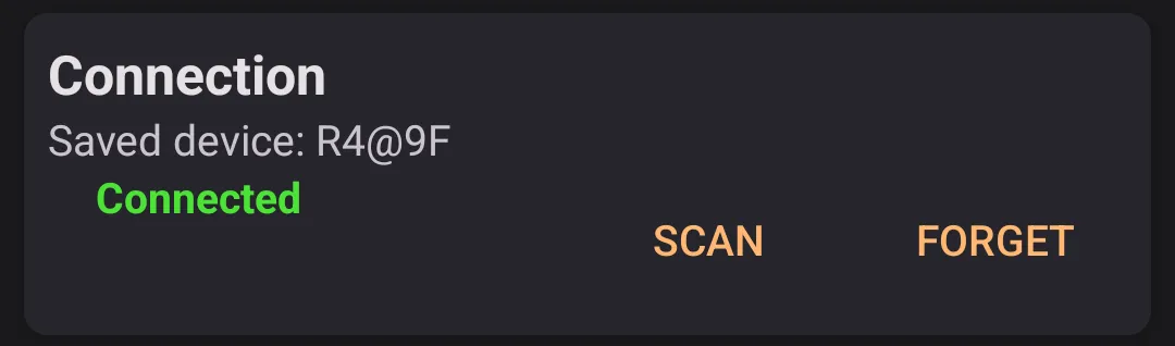 Connection displays connection status and the remembered detector name. The scan button is used to pair a new detector, and the forget button clears the currently paired one.