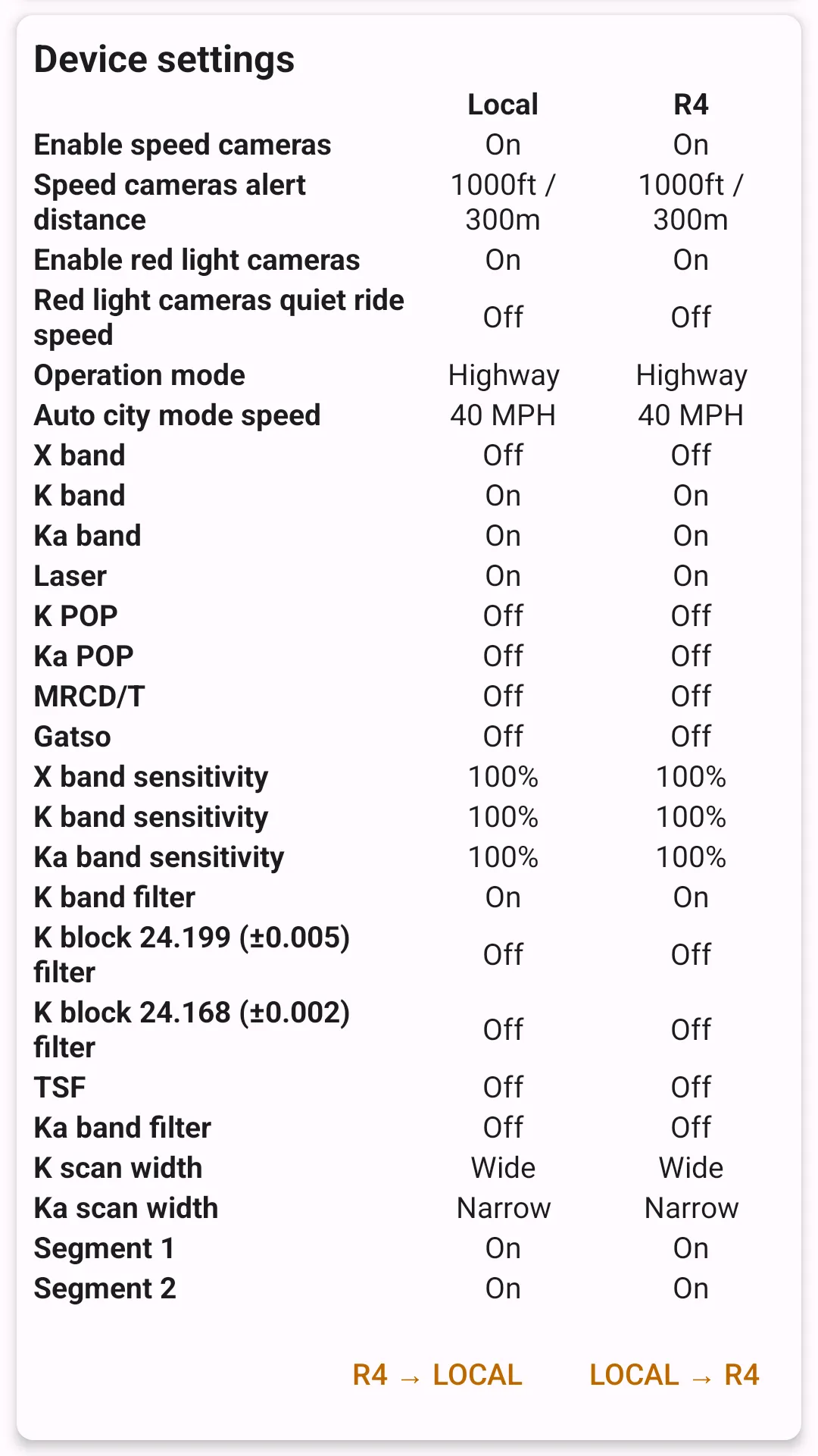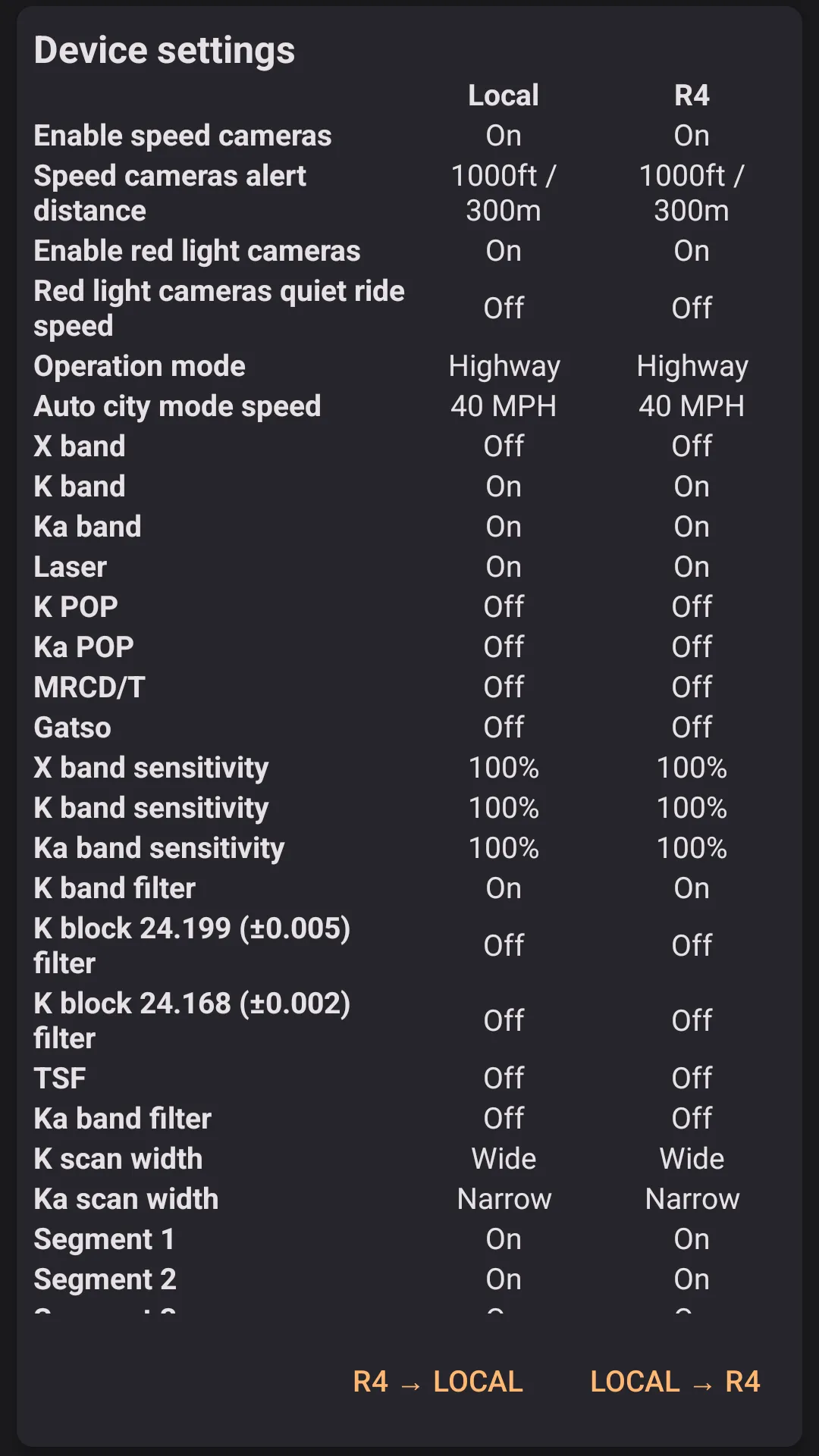 Highway Radar stores a copy of detector settings internally and supports two-way synchronization. In this section, both settings are displayed. You can change local values from the application in **`Settings → Radar detector integration → R4/R8 internal Settings``*; however, local values don't affect how the detector operates. R4 or R8 values are stored and set on the detector itself, and the detector uses them for operation.