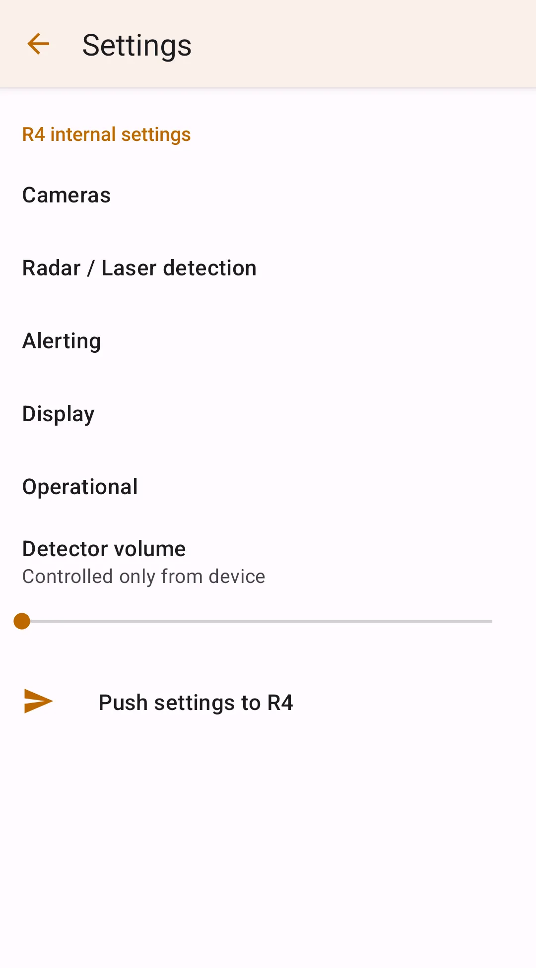 One of the good benefits of R4/R8/r9 integration is managing the detector settings from a user-friendly interface on a big phone screen. To update internal detector settings, proceed to Settings → Radar detector integration → R4/R8/R8 Internal Settings and set up your desired configuration. Then, to push the settings to the detector, tap the "Push settings to R4/R8/R9" button in the internal settings menu. Another way to push settings is proceeding to the R4/R8/R9 connection manager and pressing the Local → R4 or Local → R8 or Local → R9 button in the Device Settings section.